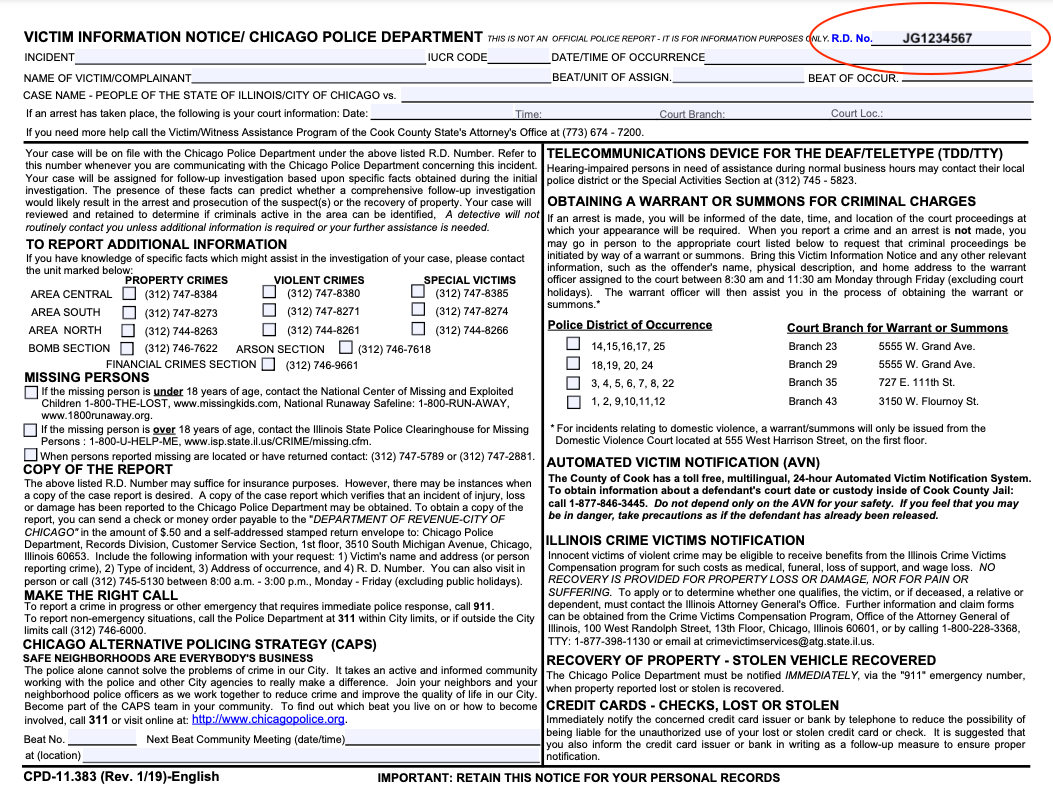 Order your report below 👇🏻If you were the victim of, or involved in, a crime, the Chicago Police Department may have issued you a Victim Information Notice. This one-page document gives you your "R.D number". Sometimes, this document is enough for insurance purposes. Often, it isn't and you need to obtain the full report.